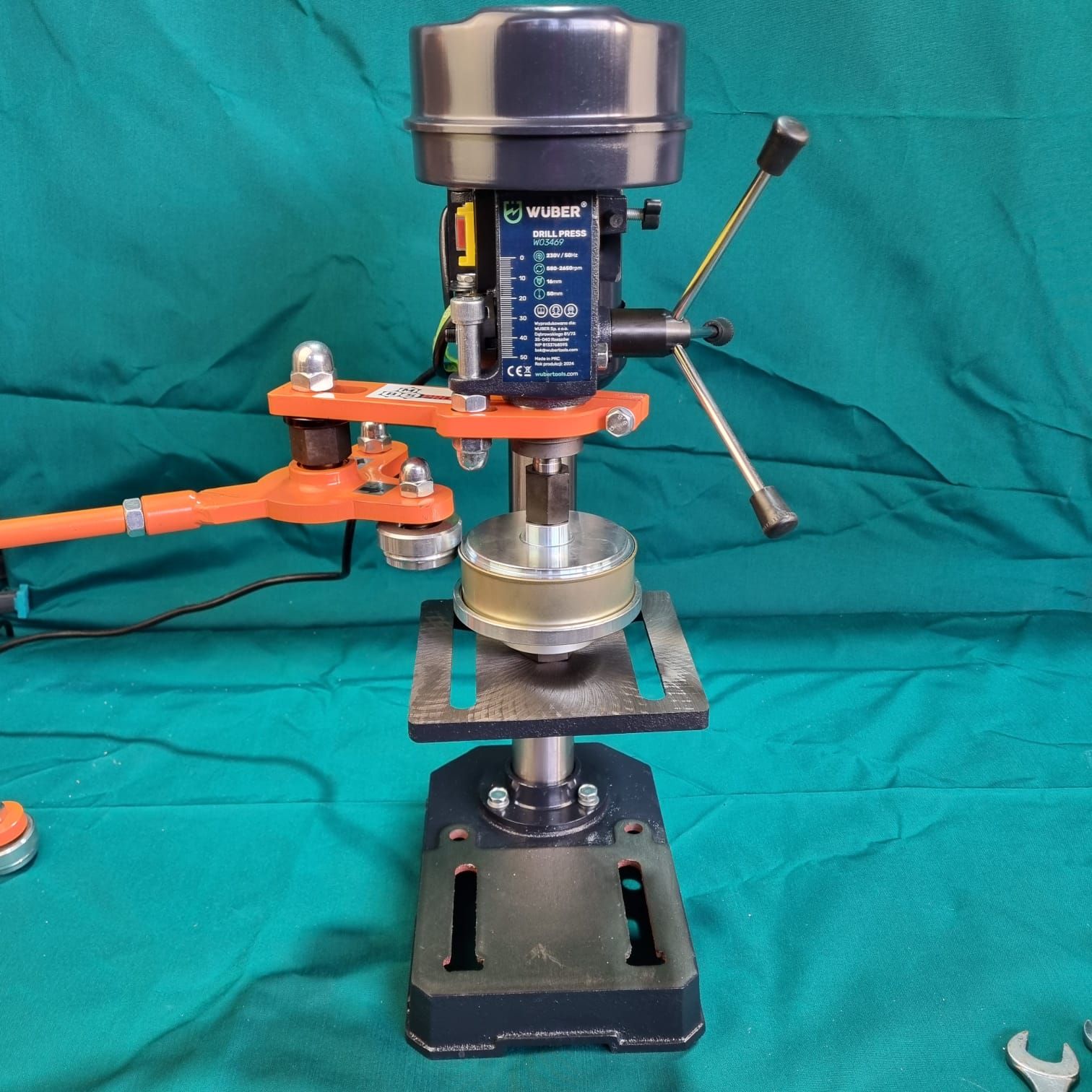 est conçu pour être installé sur une perceuse à colonne équipée d’un axe de diamètre 40 mm. Il permet un sertissage précis, fiable et régulier des boîtes de conserve, aussi bien pour un usage artisanal que semi-professionnel.